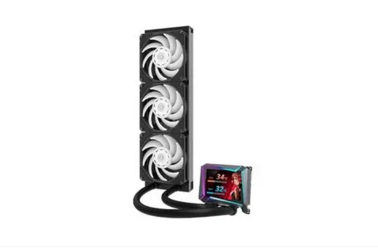 最后,威刚还将展出一款带有屏显的水冷——XPG LEVANTE PRO,一体式水冷方案,带有3.5英寸LCD屏,360mm 冷排,冷头造型独特,边缘还有钻切RGB灯条。