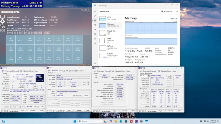首发这款内存的机型是华擎的DeskMini B860,内采用 ASRock B860M-STX 主板,搭配英特尔 Core Ultra 9 285,测试显示它有不错的超频潜力,成功超到了8133MHz,时序 CL46-52-52-130,性能媲美台式机内存。
