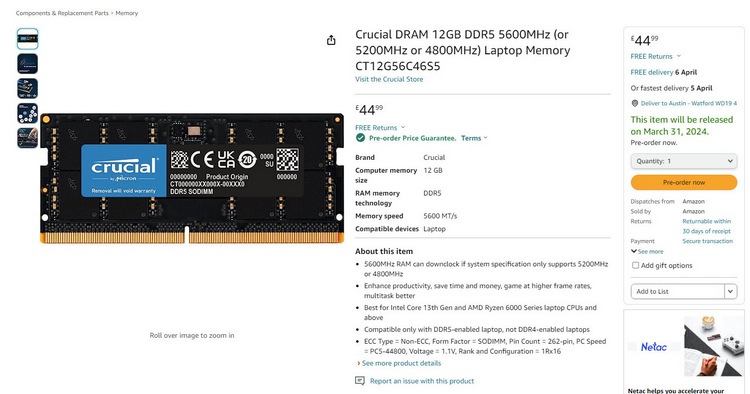 日前,美光英睿达(Critical)在英国亚马逊上架了 12/24GB DDR5 笔记本内存,单条容量12GB,为高端游戏本/迷你主机。