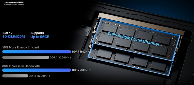 其他方面,有双槽 DDR5 5600MHz 内存槽和 PCIe M.2 SSD,最高支持 96GB 储存和 4TB PCIe SSD。
