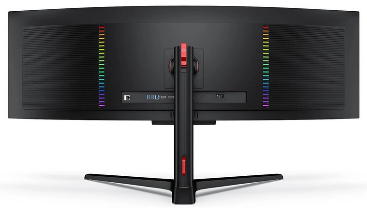 外观方面,比较战斗,屏幕三边窄边框,配备Y型底座,能俯仰角和升降调节。此外,支架带有耳机挂架和束线孔,背后虽然带有 RGB 灯条,但没有啥设计感,略糙。