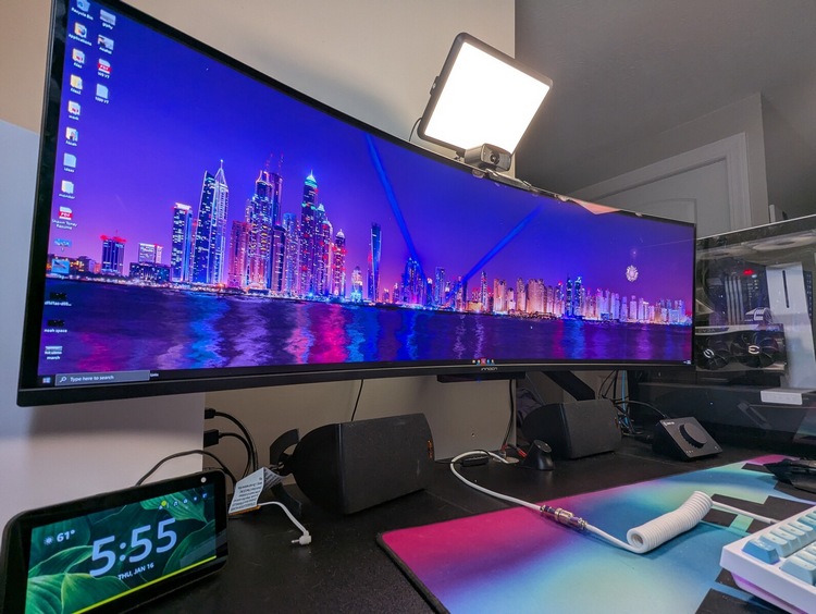 其他方面,提供5120 x 1440 分辨率,相当于两块27英寸双联屏;支持 144Hz 刷新率,0.03ms 灰阶响应,支持 NVIDIA G-SYNC 和 AMD Free Sync 防撕裂。