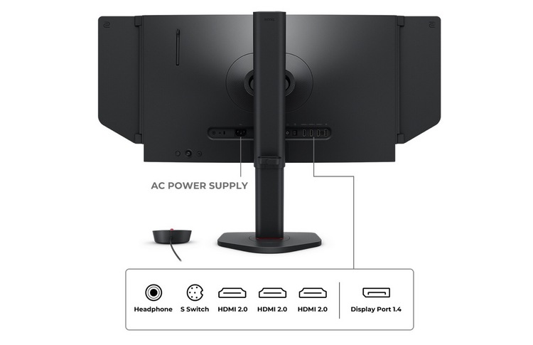 扩展方面,包括:三个HDMI 2.0、DP 1.4、耳麦插孔和 S-SWitch 专用接口,支持 PlayStation 5 或 Xbox Series X。内置电源,没说是否集成喇叭,大概率没有。
