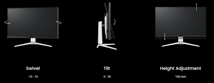 比较战斗且精致,白黑撞色,支架还有少许金色点缀,背后并集成 RGB 灯效;支架可以多向调节,除不能90度垂直旋转外都可以,能左右 ±15° 水平旋转、-5°~+20° 俯仰角和 10cm 升降。