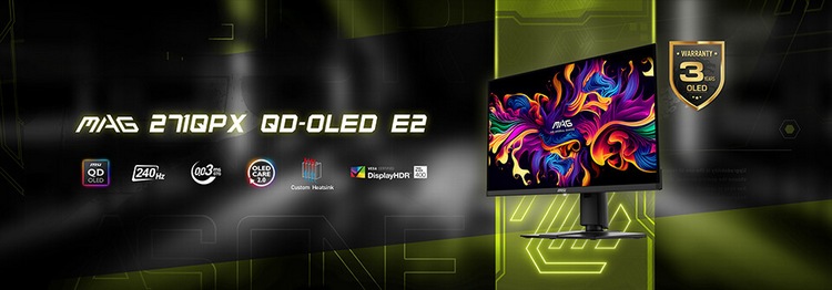 除了34英寸量子点超宽带鱼屏,微星还带来一款27英寸的 MAG 271QPX QD-OLED,虽然不大,但也基于量子点OLED屏,也有240Hz高刷和0.03ms低延迟,同样是高玩专属。