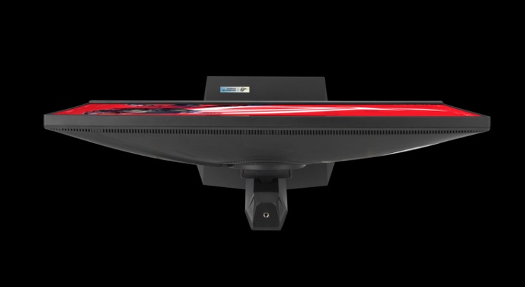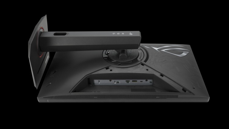 老设计,支架不战斗,背后有醒目 ROG 背光灯效(支持 Aura Sync),支架可以多向调节,允许12cm升降,垂直90度和水平以及俯仰角调节,也支持VESA 100mm 壁挂。