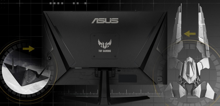 外观比较战斗,窄边框,背后有犀利线条和TUF LOGO,设计灵感来源于隐形战斗机外形,具有极强的力量感。不过支架只可以-5~23°俯仰角调节,无法旋转和升降,不过好在可以 VESA 100mm 壁挂。机身尺寸为615mm、194mm、高453mm、重4.47kg。