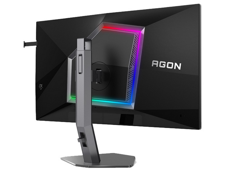 外观战斗,配备多边形不规则金属支架,背后带 RGB 灯效(AOC Light FX),也是不规则造型,而且侧面还贴心设有耳机挂架。自带支架允许多向调节,可以13cm 升降,俯仰角、水平以及垂直旋转。