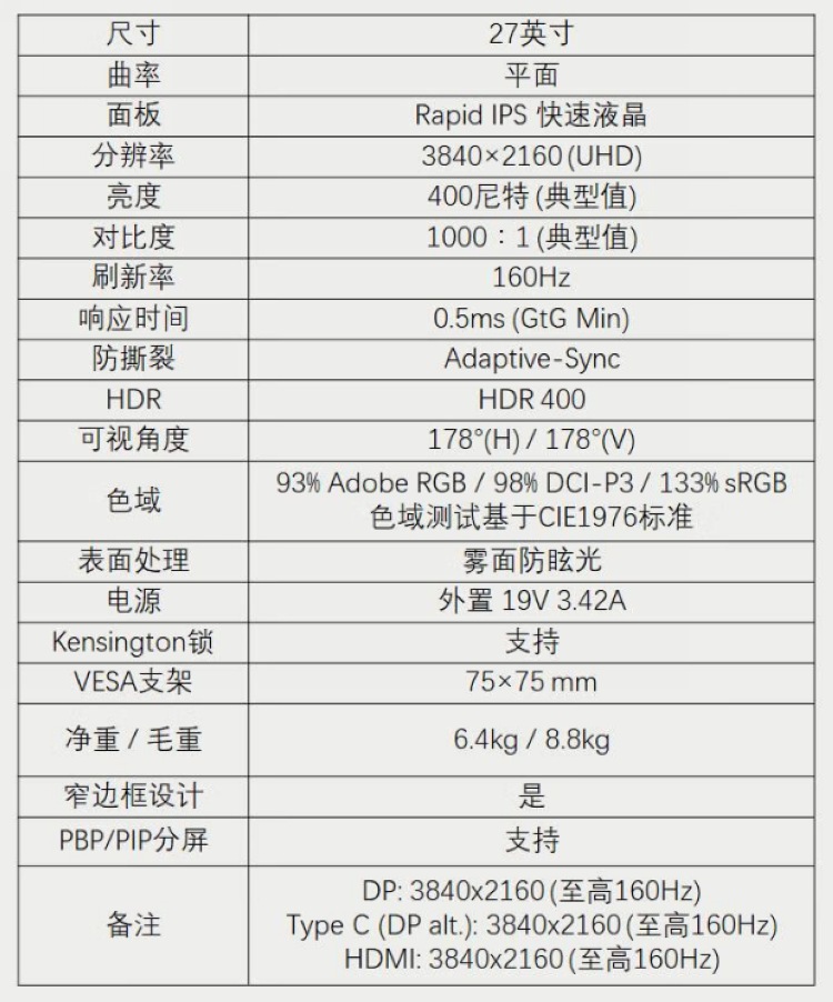规格方面,基于27英寸 Fast-IPS 面板,提供 3840 x 2160 分辨率,1000:1 静态对比度,400尼特亮度,符合 VESA DisplayHDR 400 亮度认证。