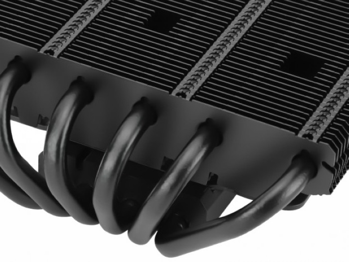 新的 AXP120-X67 ARGB 黑化/白化版整体设计、用料不变,通体黑化,高度仅为 67 mm ,重量490g(含风扇)。配有超薄风扇,不干涉旁边内存扩展。用料还不错,有6根6mm直径热管,底座也黑化抛光处理,采用镀镍C1100电解铜材质,热管与鳍片之间回流焊工艺,提升导热效率。