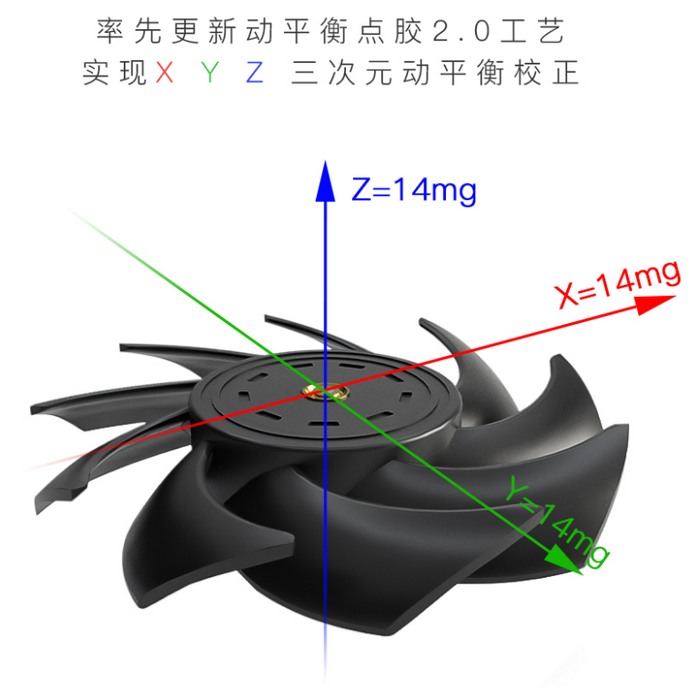 降噪方面,四角都有缓震橡胶,同时采用动平衡点胶 2.0 工艺,实现 XYZ 三次元动平衡校正。框架是三角对称式设计,增加 23% 有效出风面积,提升 20% 结构受压强度。