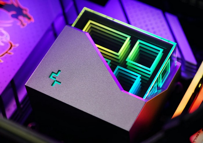 LT“冰魔方”系列水冷头很特别,缺口设计,内有独特的深邃立体块灯效,重合、交错、延伸的几何线条融入无限镜像中,结合粗犷的工业风切割外壳,加上ARGB灯效的映衬,两种风格之间的碰撞呈现了空间几何的美感。九州风神表示,其设计灵感来源于蒙德里安“几何形态派”,称之为“多维无限镜”。