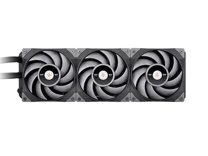 自带360mm铝制冷排,配备三把TOUGHFAN 12 Turbo风扇,转速500~2500rpm,风量71.69CFM,静风压3.44mmH2O,噪音28.1dBA,标称可压制Threadripper“线程撕裂者”处理器280W时的热量。