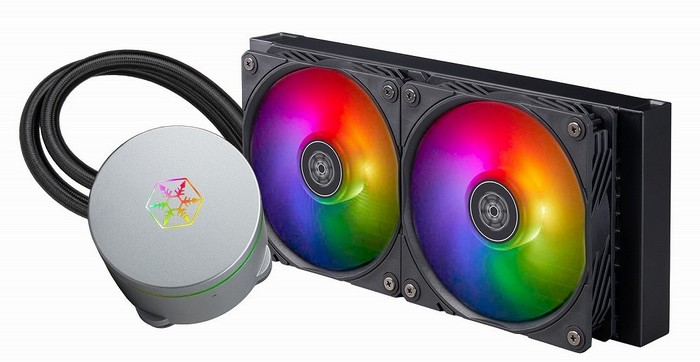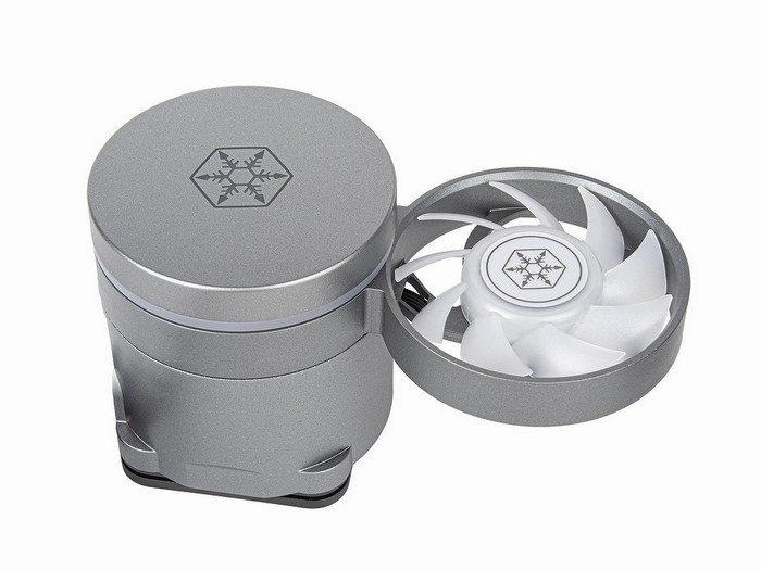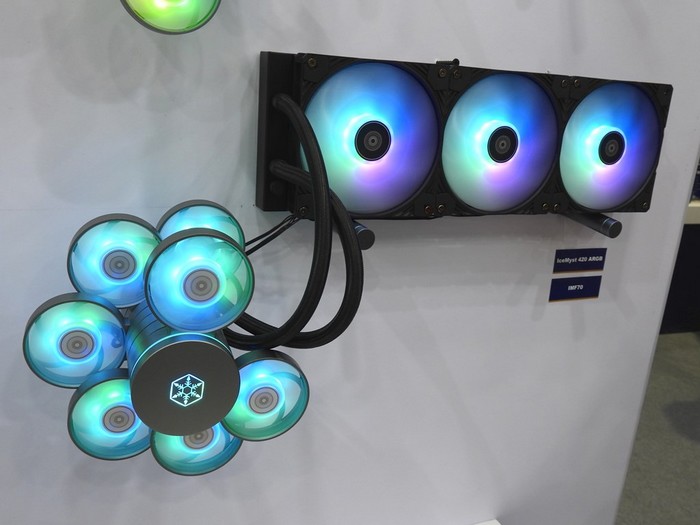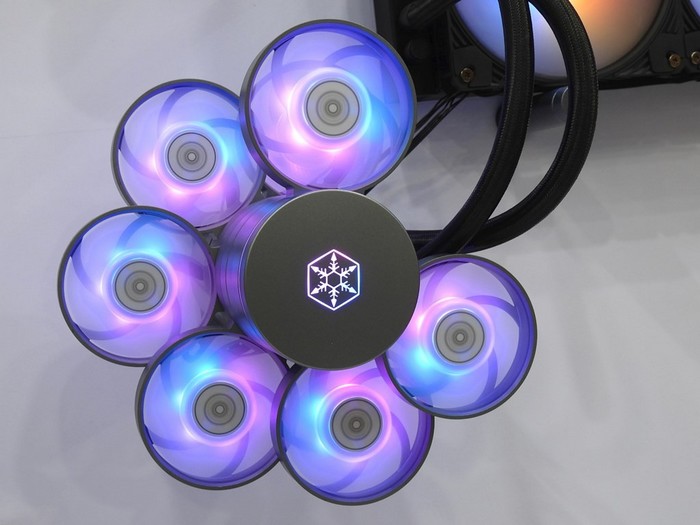 展会上曾看到,银欣 IceMyst 系列水冷头顶部最多可以堆8把风扇,风扇不大直径为7cm,带可寻址RGB灯效,可以背光同步。