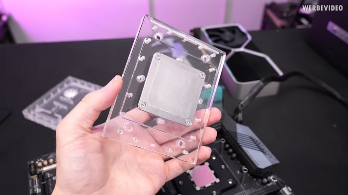 话说回来,这个冷头分两部分,上面是带有抛光纯铜底座的透明水冷头,在主板背后还有一个冷头(水道板),CPU位于中间,像夹饼一样,上下有水路连接,这样的话冷头的水路就被安排到了主板背后。