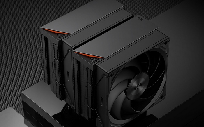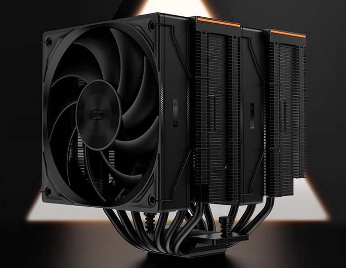 双塔结构,有6根6mm直径热管,抛光CD纹纯铜底座。值得一提的是,散热鳍片采用“三角波浪鳍片矩阵”,气动声学应用,减少风切声,同时提供高风压,提升散热鳍片散热效率。