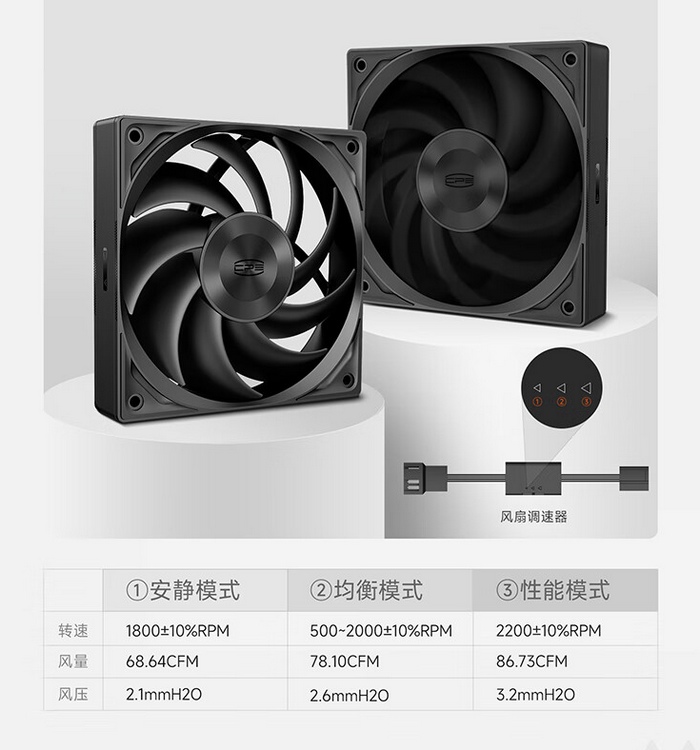 配备F5 R120双风扇,有星环金属盖设计,内有M/G级动平衡校正设计,再配合四角缓震橡胶,有效降低风扇共振噪音。值得一提的是,有物理调速器,提供三种模式(安静、均衡和性能)。