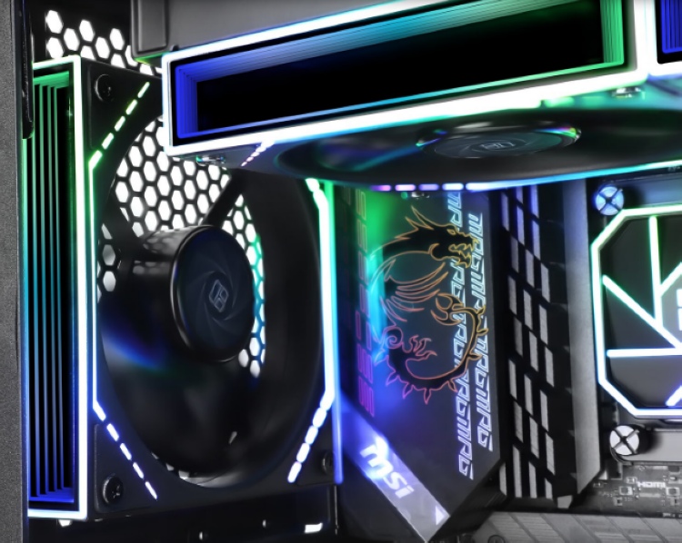 全黑配色,风扇顶部和两侧都有灯效,尤其是侧面,如下图:和冷排非常搭,也支持与板卡等背光同步。但我个人是很不喜欢这么多(乱)的RGB 灯效。