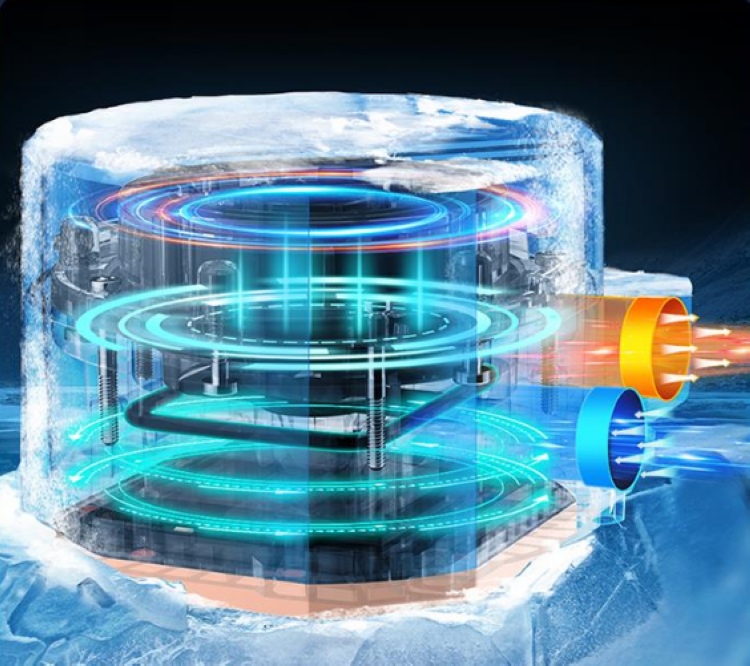 圆形水冷头的顶部有个酷冷至尊RGB 镂空LOGO,支持自定义背光或背光同步,颜值还行。内采用第 S 代双腔体,升级水流道与水压,搭配定制的铜底和下沉式铲 FIN,热阻更低,性能更好。