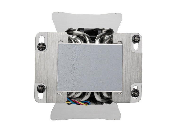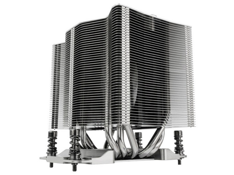 造型比较独特,没有顶盖,热管排列队形也比较特别,它有5根6mm直径热管,底座非常大,抛光镀镍工艺,非直触式,能压制 350W 处理器时的废热。