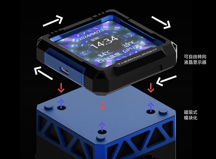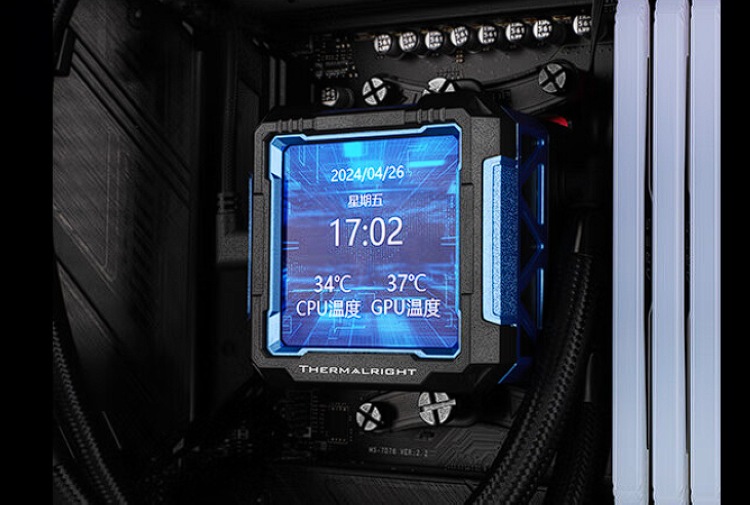 水冷头设计的很不错,机甲风格,而且是磁吸可拆卸模块化设计(也可以旋转角度)。配备2.73英寸 IPS 屏幕,320 x 320 分辨率,450尼特亮度,24bit 真彩显示,可实时显示系统运行情况,界面设计的还不错,还有时间等,并支持自定义,可使用喜欢的图片、GIF动图等,还支持投屏分享和云端更新等。