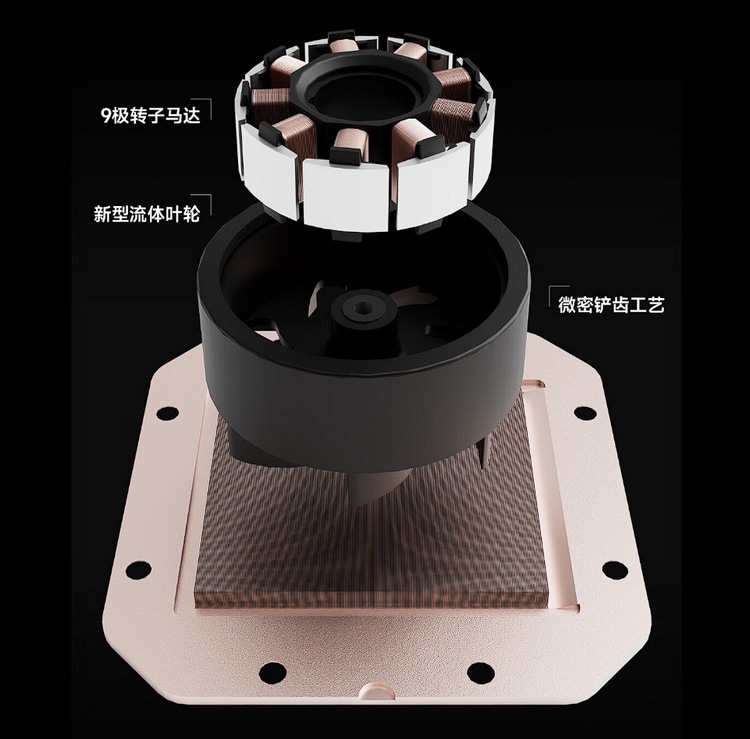 冷头内采用全新 Core V1.0 独立水泵架构,配备9极转自马达,新型流体叶轮,采用微密铲齿工艺水槽,导热效率更高。