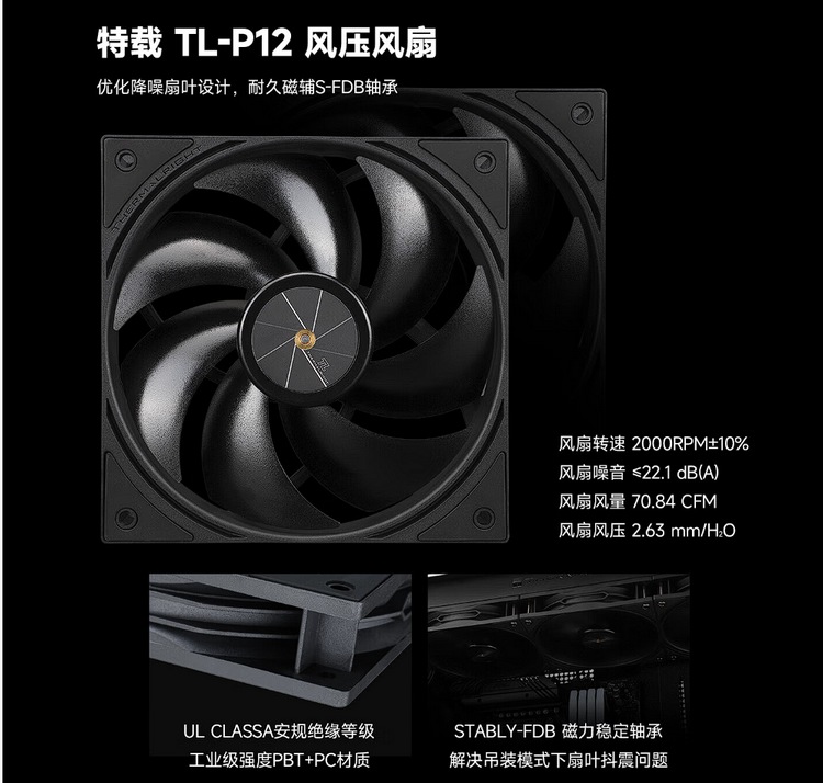 配备360mm 冷排,采用利民 TL-P12 风扇,优化风噪,采用 S-FDB 轴承,四角减震。风扇规格,转速2000rpm、风量70.84CFM、静风圧2.63mmH2O、风噪22.1dBA。
