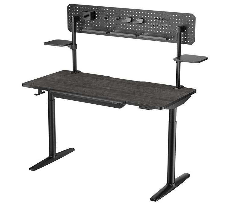 此外,骨伽还带来一款电脑桌,木质纹理表面,支持两档高度调节,带有支架,还有音箱支架,以及键盘和手托。