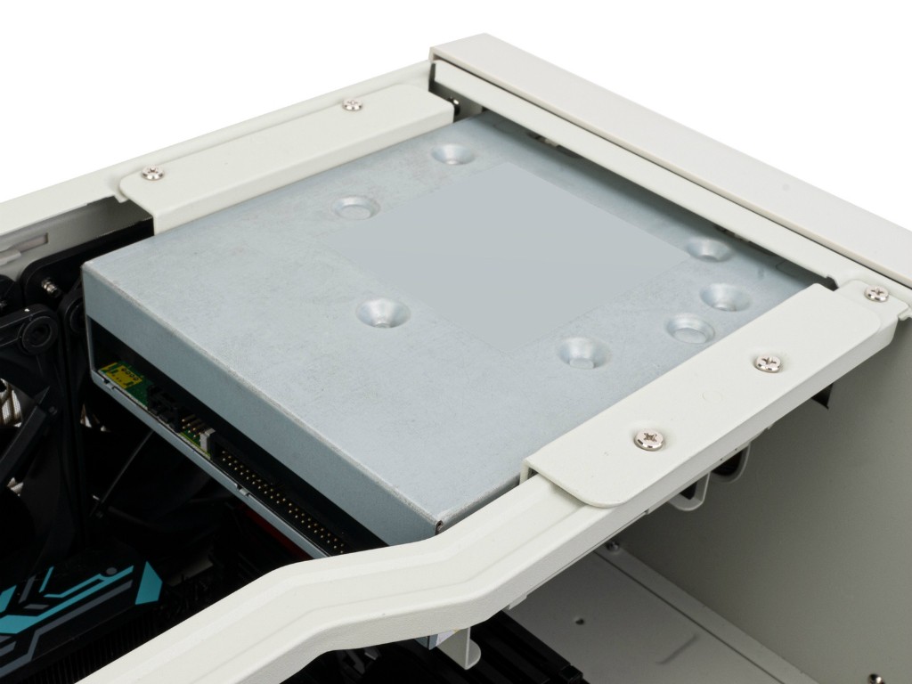储存方面,给了一个5.25英寸仓笼,可以转接双2.5英寸硬盘或单3.5英寸硬盘,在底部还能上一块2.5/3.5英寸硬盘,相当于最多支持双3.5英寸或三2.5英寸硬盘,当然本身这个仓笼也可以上光驱。
