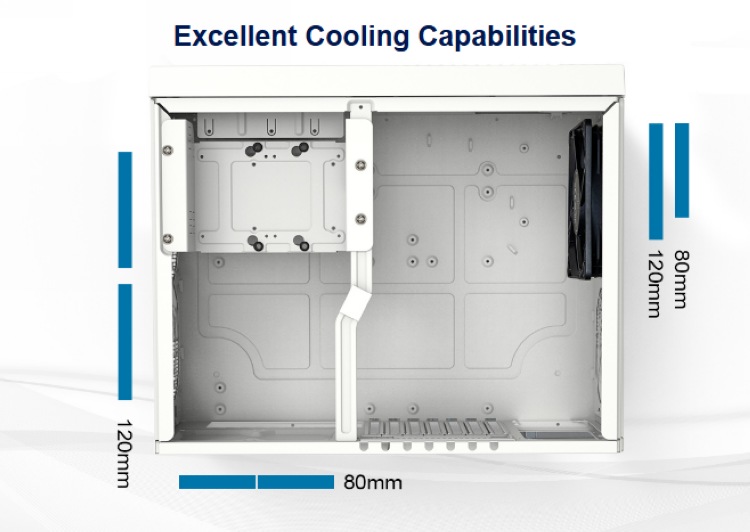 散热方面,尾部有双8cm排气风扇,右侧能上2x12cm 风扇(预装一把12cm风扇),左侧能扩展120/80mm 风扇;内水冷扩展遗憾,不支持。