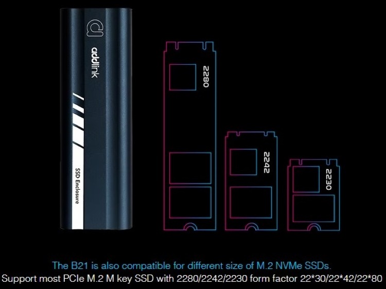 内有 1TB/2TB/4TB 三种容量,也可单独购买硬盘盒(B21 SSD Enclosure),可以自己添加硬盘,内支持 2280/2240和2230尺寸规格 M.2 固态硬盘,内有导热相变,可以长时间满载运行。本
