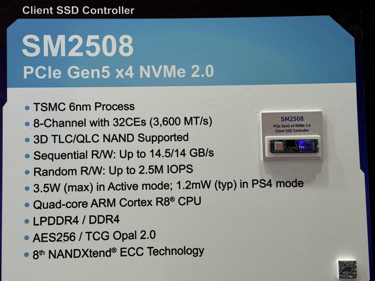 核心配置上, SM2508 为四核 Arm Cortex-R8,8通道运行速度高达3600MT/s,支持最新一代3D TLC/QLC 颗粒和 DDR4/LPDDR4内存,走PCIe 5.0 x4 通道,最高连续读取为14.5GB/s,写入14GB/s,4K随机读写2500K IOPS。