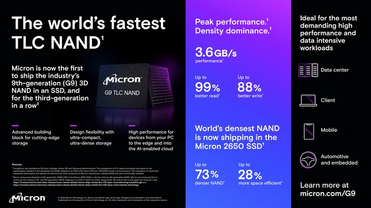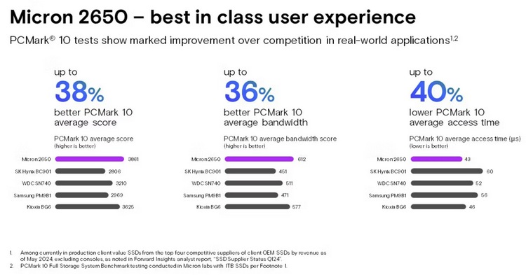先来说美光第九代颗粒本身。首发是 TLC 类型的颗粒,封装尺寸不变还是11.5 x 13.5mm,比市场竞品小28%左右;性能强大,号称3.6GB/s 业内最高传输速度,PCMark 10 测试分数高出 38%,最高读取和写入较之前分别提高99%和88%,宣称将重新定义同级SSD用户体验,为AI、个人设备、边缘服务器和其他数据密集型平台提供更好性能。
