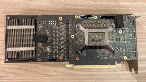 该卡的背后没有背板(工程样品),PCB不算小,但散热模组更大,PCB占到了大概3/4的面积。散热器用料未透露,肉眼看至少有四根热管,没有太大意外的话,该卡已经是三风扇散热器。
