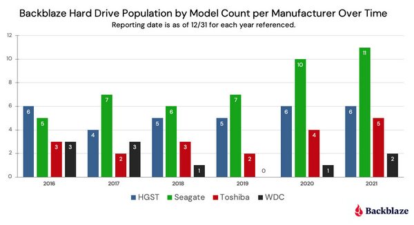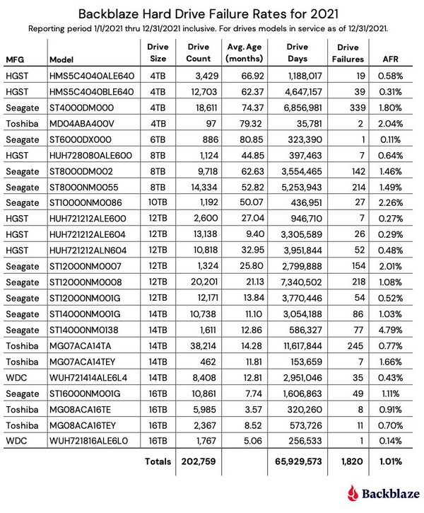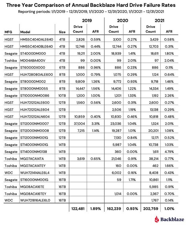 去年他们共统计了202759块硬盘,有希捷、东芝、HGST 和 WDC 各种容量和使用年限的硬盘,最新报告显示,所有硬盘的故障率从 2020 年的 0.93% 上升至 2021 年的 1.01%,但远低于 2019 年报告的 1.83%。