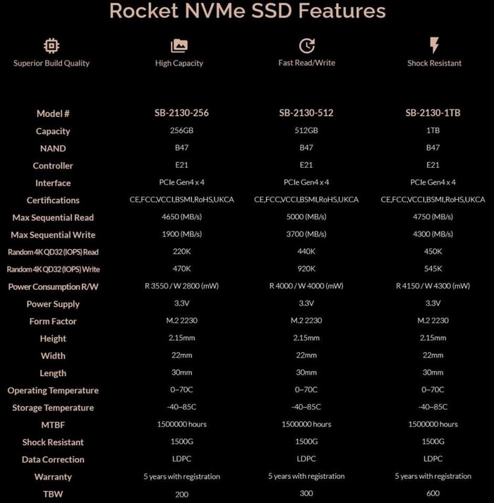这款SSD 搭载了群联的 E21T 主控,采用美光B47R 176 层颗粒(类型未知),号称在 Steam Deck 中最高连续读取可达 5000 MB/s,写入 4300 MB/s,4K随机读取450K IOPS,写入 920K IOPS。耐用性方面,从低到高 256GB/512GB和1TB 分别为 200、300 和 600 TBW 写入寿命。