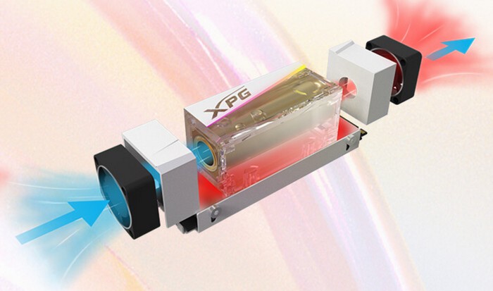 这是业内首款采用风冷+水冷混合散热方案的SSD,从结构不难看出,中间是透明水箱和散热片,前后两端是风扇,热量被传导至中间的纯铜散热片上后,通过两侧风扇将热量排出去。这套散热方案正在申请专利,号称比传统散热片温度还能再降20%左右,科技感满满。