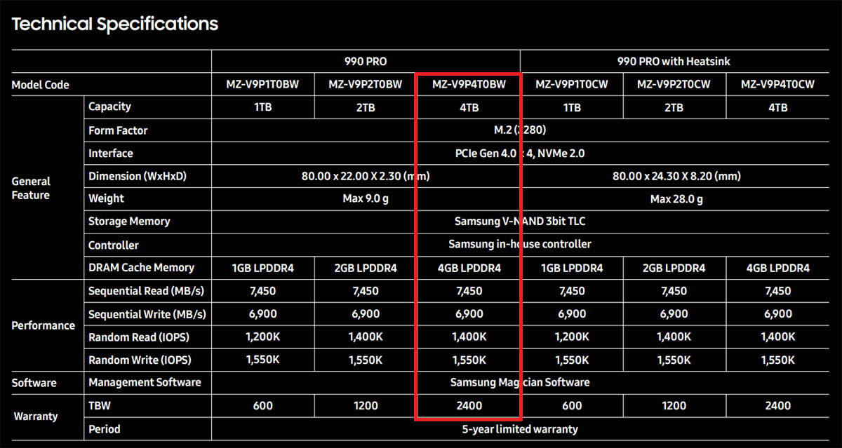 想要更大容量的小伙伴再稍微等等,今天三星又增配了 4TB 版本,读写性能不变,容量翻倍,耐用性(TBW写入总量)也因此更好。