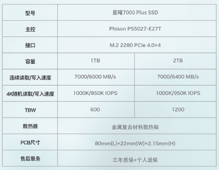 耐用性上,1TB 为 600TBW,2TB 为 1200TBW,提供三年质保+个人送包服务。