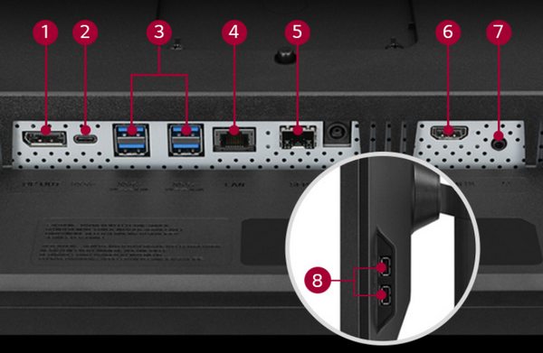 LG 34CN650N一体机的尾部的扩展非常丰富,包括:2个USB 2.0 Type-A、4个USB 3.1 Gen1 Type-A、1个全功能USB 3.1 Gen1 Type-C(带DP输出),还有HDMI、3.5mm音频接入/输出,自带了双5W喇叭。比较特别的是,除了千兆LAN,还有一个SFP电口,这在一体机上很罕见。另外,还集成无线和蓝牙5.0。