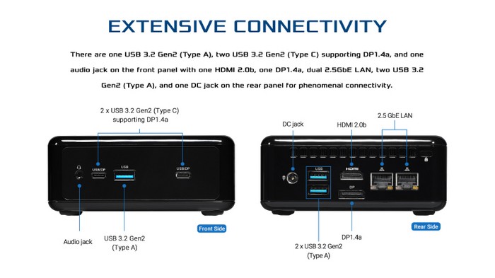 所有版本都集成 Iris Xe Graphics或Intel UHD Graphics核显,没有独显,提供双DDR4-3200 SO-DIMM(最大64GB)内存槽,1条M.2 2280 (兼容PCI-Express4.0x4)和一个SATA3.0(6Gbps)储存扩展。