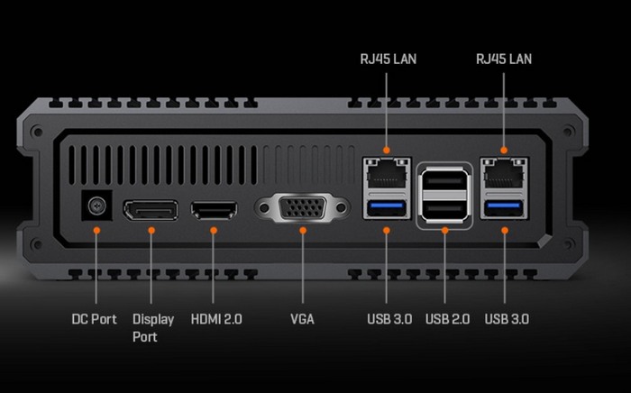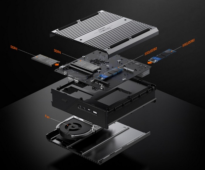 驰为新款迷你主机外观没有变化,还是浓浓工业风,机身是大量条纹进气孔,通体黑,看上去比较闷。三围尺寸为 19.15 x 19.15 x 6.09 厘米,可以平卧、垂直或VESA挂壁。