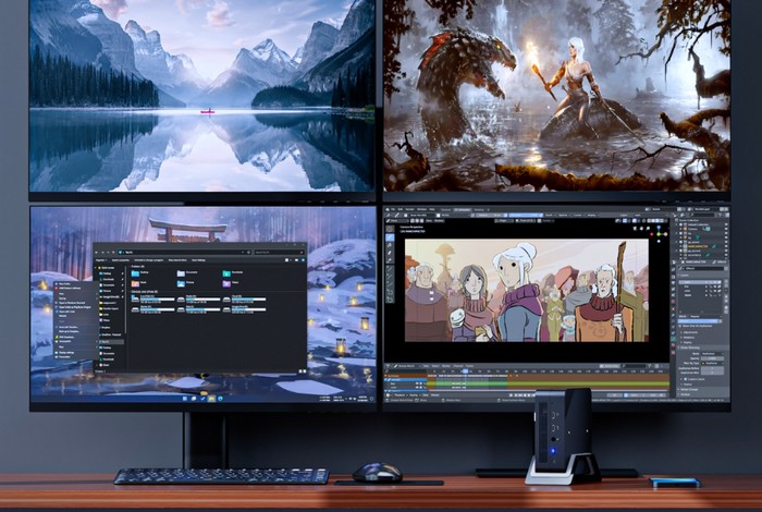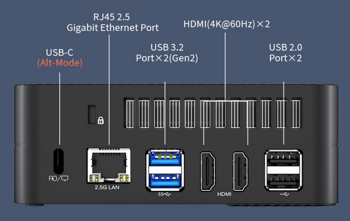 前后扩展丰富,包括:3 个 USB C(两个全功能)、2 个 USB 3.2 Gen 2 Type-A、2 个 USB 2.0 Type-A、2个HDMI、1 个千兆LAN和3.5mm插孔,它可以外接四路4K@60Hz显示器。