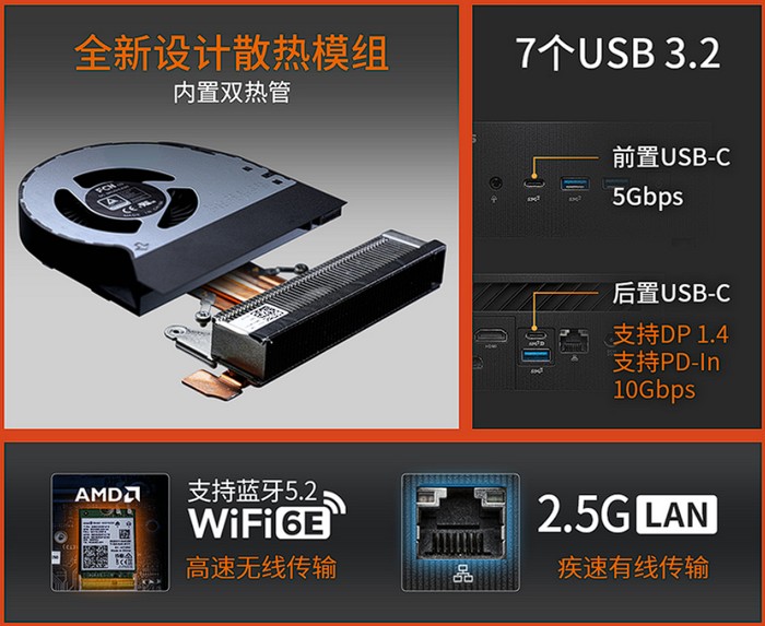 其他方面,提供 WIFI 6E 无线和蓝牙5.2,扩展有:2.5G千兆,HDMI 和 全功能USB-C等。