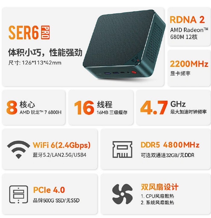另外,配有双通道DDR5 4800MHz内存槽,PCIE 4.0 SSD固态硬盘,不够的话还可以扩展一块SATA 2.5英寸硬盘,支持WIFI6无线,有双风扇散热模组。