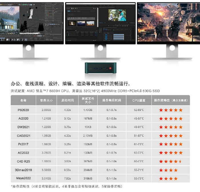 外观不多说了,依旧紧凑小巧,铝制机身,大量CNC透气孔,前后扩展相对丰富。内搭载AMD锐龙6000H系列标压处理器,可选 8 核 16 线程的 R7 6800H ,加速频率可达 4.7GHz;核显为 Radeon 680M,GPU 频率 2.2GHz。值得一提的是,这款可能随后还有低配版,搭载锐龙5 6600H处理器,相对而言推荐低配,当然需要更强CPU的话不用犹豫选择高配。