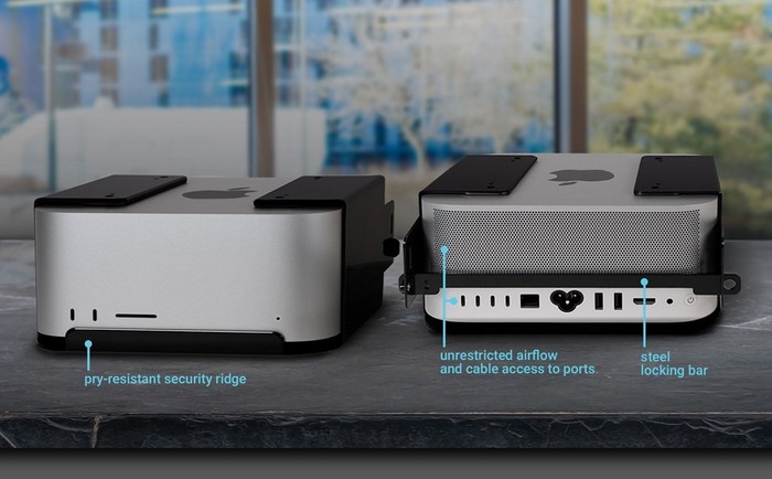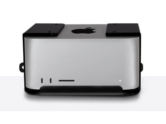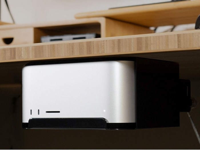 由于 Mac Studio 个头不小,比较厚,因此无法塞在显示器支架下面,只能是放在桌面显示器旁边。而这款支架与 Mac Studio 严丝合缝,除了固定防盗外,可以将其固定在任何地方,比如桌面底部,墙壁上等。