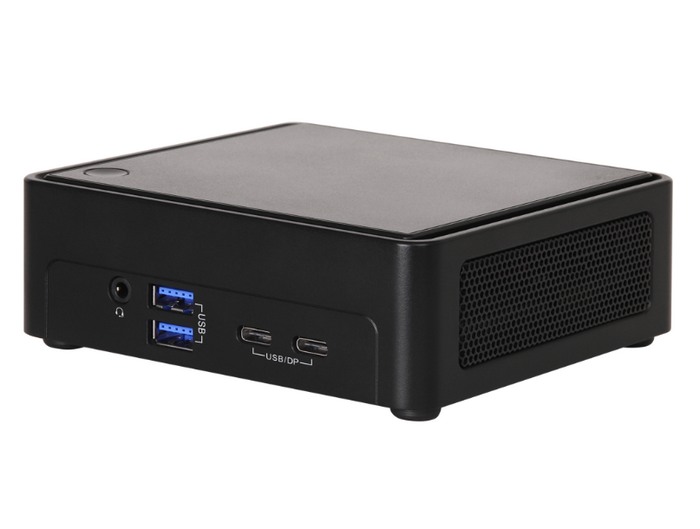 整体机身比较规整,不是登机箱的模具,而是常规四四方方很像传统NUC的设计。这款个头更小巧一些,尺寸为117.5 x 110 x 38mm,约900克,因为它没有2.5英寸硬盘仓位,如果需要SATA 2.5英寸SSD/HDD扩展的话,建议选择更强的 NUC 1300 BOX 那款。