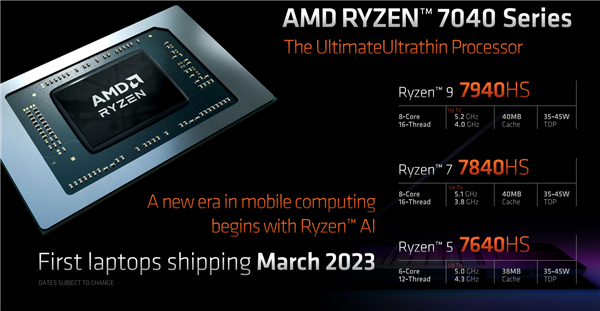 另外,7040HS系列还有一个R5 7640HS,会是游戏本最常见核心,为6核12线程,主频4.3-5.0GHz,38MB缓存,35W-45W+TDP。