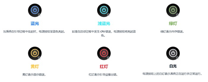值得一提的是,前面的开关机按键有不同颜色的背光,也是Debug纠错指示灯,白色表示正常运行,蓝色表示正常待机中,绿色表示内存有问题,冰蓝表示CPU有问题,红色表示系统引导启动有问题,黄色表示显示输出有问题,这个设计很好。